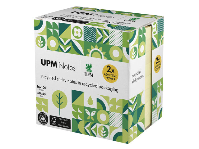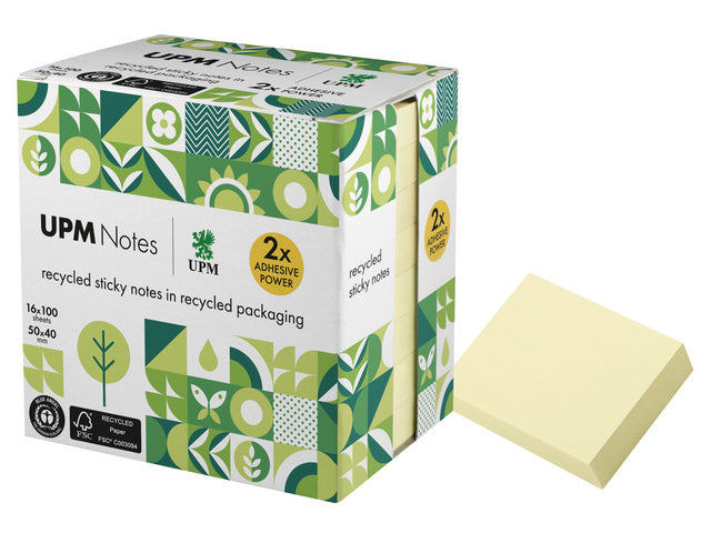 De UPM sticky notes zijn het meest populaire notitieblok in kantoren, scholen en huishoudens over de hele wereld. Ze zijn een 'must-have' voor elke werkplek. Voorzien van 25 mm plakrand met lijm op waterbasis met dubbele kleefkracht, in vergelijking met standaard plaknotities, en gemakkelijk te verwijderen en opnieuw te plaatsen zonder residu. UPM Notes zijn gemaakt van FSC-gecertificeerd (FSC C003094) papier uit duurzaam beheerde bossen en andere gecontroleerde bronnen. De notitieblokken zijn zorgvuldig verpakt in een kartonnen doos van gerecycled materiaal, dat de blokken beschermt tegen vuil en beschadiging. De verpakking kan gemakkelijk worden weggegooid in de papierbak, zodat het probleemloos gerecycled kan worden. Gecertificeerd met het Blauwe Engel keurmerk, het oudste eco-label ter wereld. Formaat blok 50x40mm. Inhoud 16x blok met 100 vel in pastelgeel.