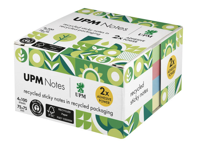De UPM sticky notes zijn het meest populaire notitieblok in kantoren, scholen en huishoudens over de hele wereld. Ze zijn een 'must-have' voor elke werkplek. Voorzien van 25 mm plakrand met lijm op waterbasis met dubbele kleefkracht, in vergelijking met standaard plaknotities, en gemakkelijk te verwijderen en opnieuw te plaatsen zonder residu. UPM Notes zijn gemaakt van FSC-gecertificeerd (FSC C003094) papier uit duurzaam beheerde bossen en andere gecontroleerde bronnen. De notitieblokken zijn zorgvuldig verpakt in een kartonnen doos van gerecycled materiaal, dat de blokken beschermt tegen vuil en beschadiging. De verpakking kan gemakkelijk worden weggegooid in de papierbak, zodat het probleemloos gerecycled kan worden. Gecertificeerd met het Blauwe Engel keurmerk, het oudste eco-label ter wereld. Formaat blok 75x75mm. Inhoud 4x blok met 100 vel in de pastel kleuren groen, roze, blauw, geel.