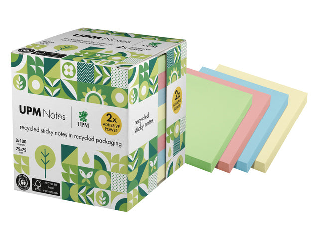 De UPM sticky notes zijn het meest populaire notitieblok in kantoren, scholen en huishoudens over de hele wereld. Ze zijn een 'must-have' voor elke werkplek. Voorzien van 25 mm plakrand met lijm op waterbasis met dubbele kleefkracht, in vergelijking met standaard plaknotities, en gemakkelijk te verwijderen en opnieuw te plaatsen zonder residu. UPM Notes zijn gemaakt van FSC-gecertificeerd (FSC C003094) papier uit duurzaam beheerde bossen en andere gecontroleerde bronnen. De notitieblokken zijn zorgvuldig verpakt in een kartonnen doos van gerecycled materiaal, dat de blokken beschermt tegen vuil en beschadiging. De verpakking kan gemakkelijk worden weggegooid in de papierbak, zodat het probleemloos gerecycled kan worden. Gecertificeerd met het Blauwe Engel keurmerk, het oudste eco-label ter wereld. Formaat blok 75x75mm. Inhoud 8x blok met 100 vel in de pastel kleuren groen, roze, blauw, geel.