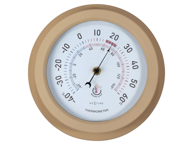 De NeXtime "Lily" is een metalen tuinthermometer die buiten gebruikt kan worden. Het gebruik van extra rubberen ringen om te voorkomen dat het water de kwetsbare delen van de thermometer bereikt, maakt deze meter bijzonder en weerbestendig. De thermometer is robuust en van metaal en met Ø 22cm past hij overal. De wijzerplaat is wit en heeft grote cijfers en blauwe en rode kleuren voor een goed begrip van de huidige temperatuur. Door de zwarte wijzer is de meter goed afleesbaar. De meter heeft geen batterijen nodig.