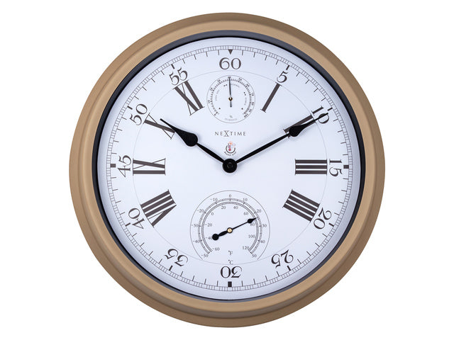 De NeXtime "Hyacinth" is een zeer complete grote metalen tuinklok die ook de temperatuur en de luchtvochtigheid aangeeft. Speciaal gemaakt voor buiten! Het gebruik van extra rubberen ringen om te voorkomen dat het water de kwetsbare delen van de klok bereikt, maakt deze klok bijzonder en weerbestendig. Als u op de hoogte wilt zijn van uw tuin, dan is dit de klok voor u! Tijd, temperatuur en vochtigheid in 1 apparaat. De klok is robuust en van metaal en met een diameter van 22cm past hij overal. De kast is in de kleur van warm zand en de wijzerplaat is gebroken wit en heeft Romeinse cijfers voor een goed begrip van de huidige waarden. Door de zwarte wijzers zijn de klok en de meters goed afleesbaar. De klok werkt op 1 AA-batterij (niet inbegrepen).
