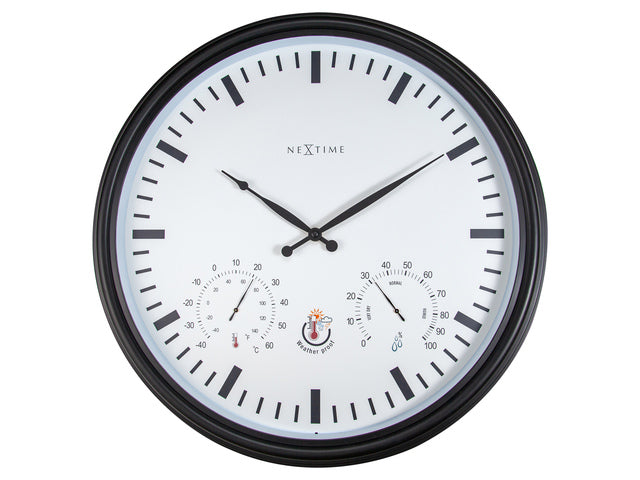 De NeXtime "Sunflower" is een zeer complete grote kunststof tuinklok die ook de temperatuur en de luchtvochtigheid aangeeft. Speciaal gemaakt voor buiten! Het gebruik van extra rubberen ringen om te voorkomen dat het water de kwetsbare delen van de klok bereikt, maakt deze klok bijzonder en weerbestendig. Als u op de hoogte wilt zijn van uw tuin, dan is dit de klok voor u! Tijd, temperatuur en vochtigheid in 1 apparaat. De klok is robuust en van kunststof en met Ø 50,8cm een echte eye catcher. De kast is in zwarte kleur en de wijzerplaat is wit en heeft een streepindex. Door de zwarte wijzers zijn de klok en de meters goed afleesbaar. De klok werkt op 1 AA-batterij (niet inbegrepen).