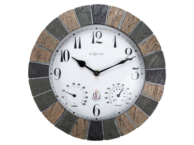 De NeXtime "Aster" is een zeer complete tuinklokmaat van steen die buiten gebruikt kan worden. Het gebruik van extra rubberen ringen om te voorkomen dat het water de kwetsbare delen van de klok bereikt, maakt deze klok bijzonder en weerbestendig. De klok is robuust en stijlvol door de steenlook. Hij past perfect in elke tuin en past gemakkelijk in de tuin. Met zijn afmeting van 26 cm past hij overal. Als u op de hoogte wilt zijn van uw tuin, dan is dit de klok voor u! Tijd, temperatuur en vochtigheid in 1 apparaat. De wijzerplaat is wit en heeft een grote index voor de uuraanduiding. Door de zwarte wijzers zijn de klok en de meters goed afleesbaar. De klok werkt op 1 AA-batterij (niet inbegrepen).
