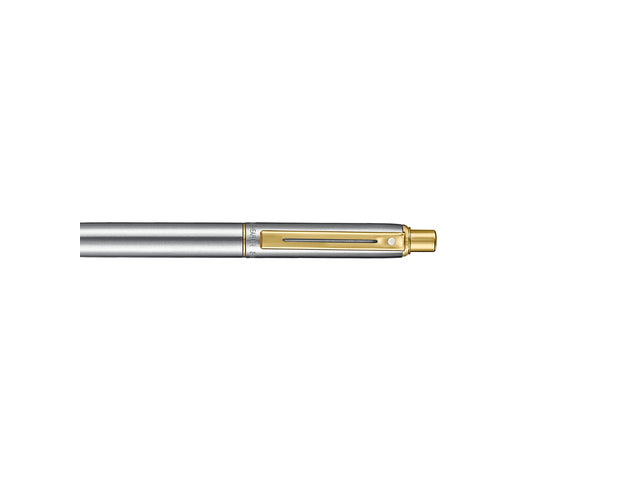 Sheaffer balpen Sentinel 333 met houder in geborsteld chroom met goudkleurige afwerking garandeert een nauwkeurig en betrouwbaar schrijfcomfort. Inclusief een universeel standaard Sheaffer medium balpenvulling in zwart. De Sheaffer balpen Sentinel is het slanke, ingetogen klassieke ontwerp met een solide en contrasterende afwerking die de look afmaken. De wereldwijd erkende witte Sheaffer stip, die symbool staat voor schrijfexcellentie, kwaliteit en prestige, is terug te vinden op de clip. De Sheaffer Sentinel pennen zijn beschikbaar in een breed scala van eigentijdse kleuren en worden geleverd in mooie geschenkdoos.