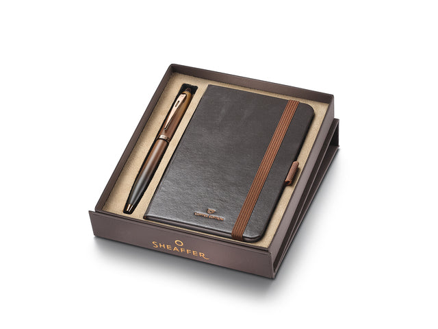 Sheaffer giftset balpen 100 E9374 met A6 notitieboek. De balpen in licht koffiebruin kleurverloop met een matte textuur en koffiebruin gecoat PVD afwerking garandeert een nauwkeurig en betrouwbaar schrijfcomfort. Inclusief een universeel standaard Sheaffer medium balpenvulling in zwart. De populaire Sheaffer balpen 100 met zijn moderne ontwerp en de subtiel uitgesneden clip, is een betaalbare manier om de schrijfervaring naar een hoger niveau te tillen en tegelijkertijd indruk te maken. Deze Coffee Edition is perfect voor dagelijks gebruik en ontworpen voor koffieliefhebbers die graag met woorden spelen. De pen heeft een exclusief insigne bovenop de dop. De wereldwijd erkende witte Sheaffer stip, die symbool staat voor schrijfexcellentie, kwaliteit en prestige, is terug te vinden op de clip. De balpen en notitieboek worden geleverd in mooie geschenkdoos.