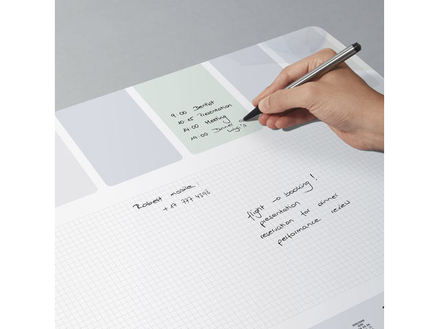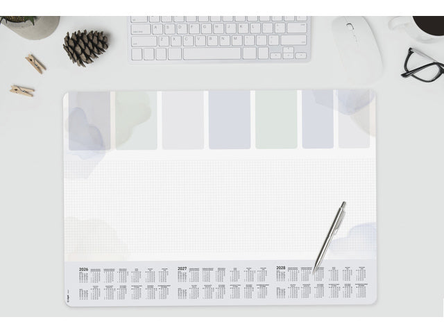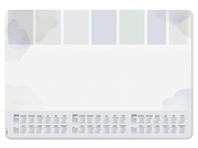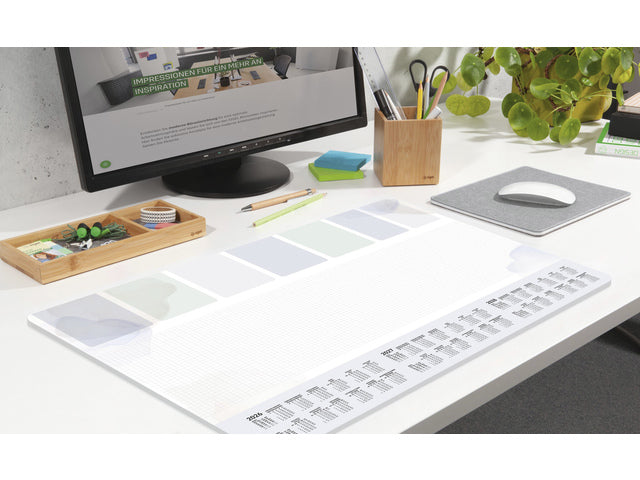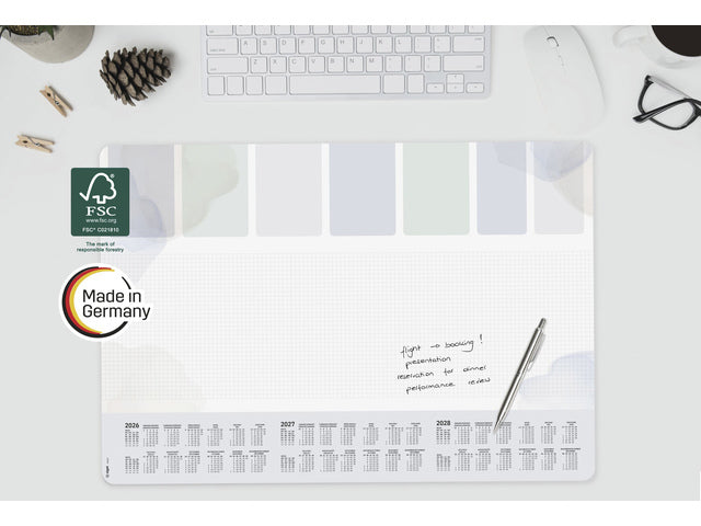 Praktische bureauonderlegger met dag-weekplan en actuele kalender voor 3 jaren. Formaat ca. A2 (59,5x41cm) met afgeronde hoeken en hoogwaardig 80 grams papierkwaliteit (FSC-gecertificeerd) met ruit-liniatuur. Taal D/GB/F/NL. De papier-schrijfonderlegger heeft 30 vel en kan als een afscheurblok worden gebruikt. De stevige kartonnen rug met verlijming aan de onderkant en gedeeltelijk aan de bovenkant voorkomen dat de hoeken omknikken.Ideaal formaat voor elk bureau: een blikvanger, decoratief, praktisch en beschermt uw bureau op kantoor en thuis tegen inkt en hete kopjes. Kalender 2026/2027/2028.