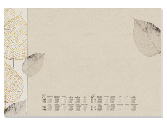 Praktisch bureauonderlegger "Natural Leaves" in formaat ca. A2 (59,5x41cm). De bureauonderlegger heeft 30 vel 80 grams FSC-gecertificeerd papier met natuurmotief, is afscheurbaar en beschrijfbaar, met een actuele 2-jarige kalender 2026/2027. Taal D/GB/F/NL. De stevige kartonnen rug met verlijming aan de onderkant en gedeeltelijk aan de bovenkant voorkomen dat de hoeken omknikken. Ideaal formaat voor elk bureau: een blikvanger, decoratief, praktisch en beschermt uw bureau op kantoor en thuis tegen inkt en hete kopjes.