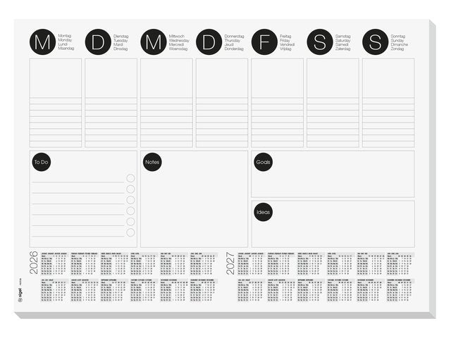 Bureauonderlegger met dag-weekplan en extra veel ruimte voor notities en to-do-lijst. In formaat A3 (42x29,7cm). Inhoud 30 vel afscheurbaar en beschrijfbaar 80 grams papier met een actuele 2-jaren kalender. Taal NL/FR/D/GB. De stevige kartonnen rug met verlijming aan de onderkant en gedeeltelijk aan de bovenkant voorkomen dat de hoeken omknikken. Kalender 2026/2027.