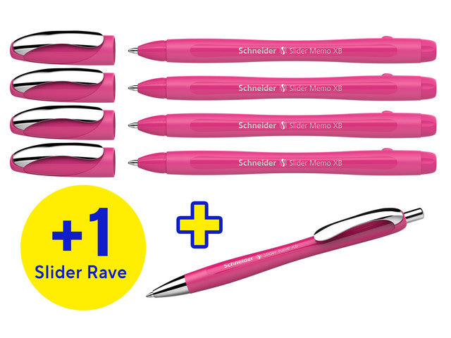 Balpen Slider Memo met Viscoglide®-technologie voor buitengewoon soepel en glijdend schrijven in lijndikte Extra Breed (XB). De inkt droogt snel - zelfs op glad papier - en is veegvast wanneer je deze later markeert. De ergonomisch gevormde, royaal rubberen houder is ontworpen om ontspannen te schrijven zonder de hand te vermoeien. De dop heeft een stevige metalen clip en past op beide uiteinden van de pen. De slijtvaste roestvrijstalen punt garandeert dat de grote inktvoorraad volledig kan worden gebruikt en niet uitloopt. Milieuvriendelijk en grondstofbesparende houder gerecycled kunststof: Memo 85%, Rave 68%. Product met financiële klimaatbijdrage: met de aankoop van het product wordt een gecertificeerd klimaatbeschermingsproject gesteund. Promotieset met gratis intrekbare balpen Slider Rave. Inhoud doosje 4 Slider Memo + 1 gratis Slider Rave, schrijfkleur blauw, houderkleur power roze.