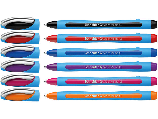 Balpen Slider Memo met Viscoglide®-technologie voor buitengewoon soepel en glijdend schrijven in lijndikte Extra Breed (XB). De inkt droogt snel - zelfs op glad papier - en is veegvast wanneer je deze later markeert. De ergonomisch gevormde, royaal rubberen houder is ontworpen om ontspannen te schrijven zonder de hand te vermoeien. De dop heeft een stevige metalen clip en past op beide uiteinden van de pen. De slijtvaste roestvrijstalen punt garandeert dat de grote inktvoorraad volledig kan worden gebruikt en niet uitloopt. Milieuvriendelijk en grondstofbesparende houder van 85% gerecycled kunststof. Product met financiële klimaatbijdrage: met de aankoop van het product wordt een gecertificeerd klimaatbeschermingsproject gesteund. Inhoud doosje 5+1 gratis promotieset: schrijfkleuren zwart, rood, blauw, violet, roze en oranje