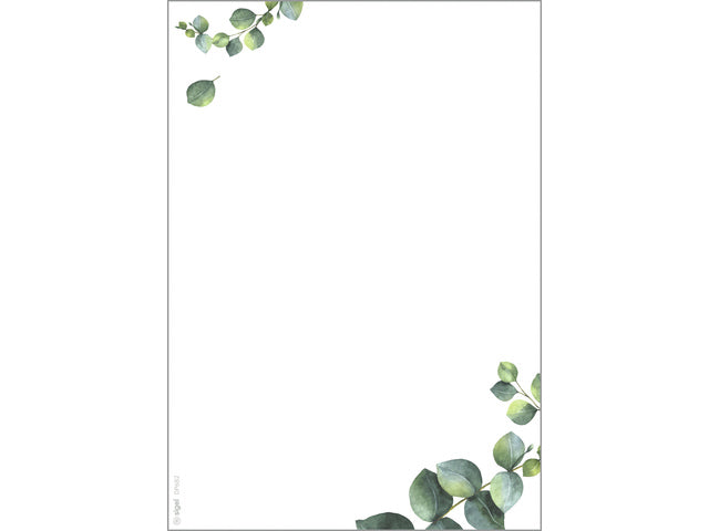 Designpapier met motief, tweezijdig bedrukt. Formaat A5. Fijnpapier 90 grams FSC Mix. Inhoud 100 vel. Papier geschikt voor inkjet-, laser- en kopieermachine. Ook perfect om op te schrijven. Papier kan voor vele gelegenheden en talloze doeleinden worden gebruikt: als uitnodiging, menukaart, voor alle soorten felicitaties of gewoon als informatie of aanbieding. Motief Eucalyptus.