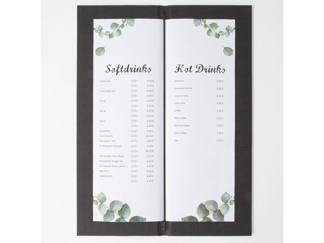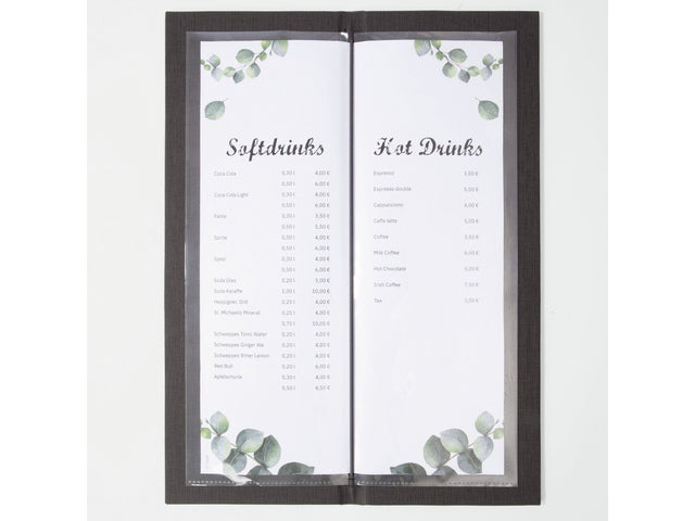 De tijdloze en hoogwaardige drankenmap heeft een rubberbinding aan de binnenzijde met 2 inschuifbare dubbele transparante insteekhoezen voor in totaal 8 pagina's informatie. De pagina's kunnen eenvoudig worden ingevoegd en steeds opnieuw worden uitgewisseld. Geschikt voor A4-formaat. Slijtvaste PU omslag met elegante linnenstructuur. Het duurzaam PU-materiaal (zonder weekmakers) is bestand tegen slijtage, krassen en schuren en eenvoudig schoon te maken. De drankenmap is ideaal voor dagelijks gebruik in de horeca. Kleur map antraciet.