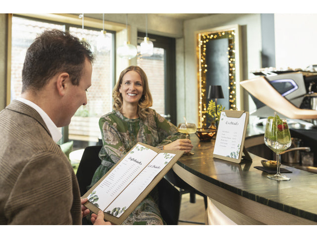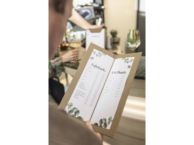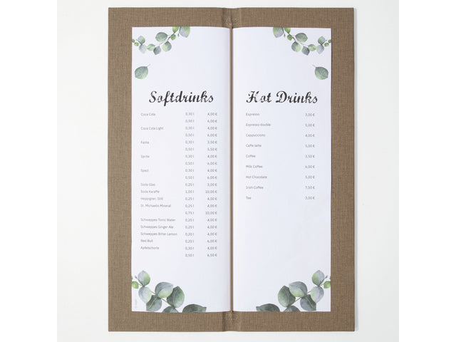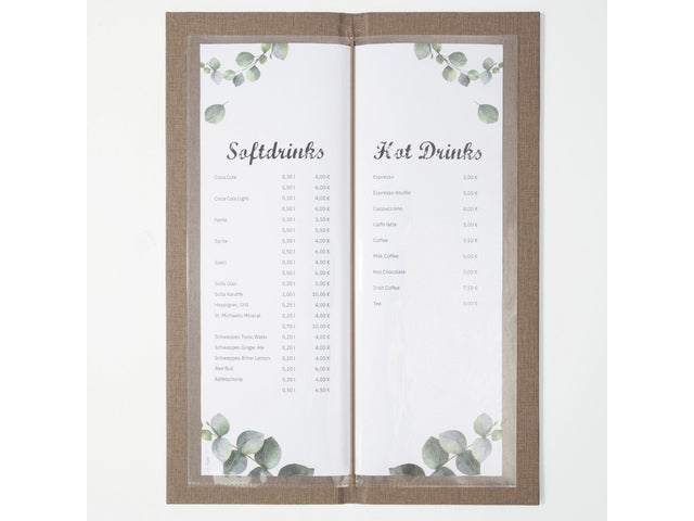De tijdloze en hoogwaardige drankenmap heeft een rubberbinding aan de binnenzijde met 2 inschuifbare dubbele transparante insteekhoezen voor in totaal 8 pagina's informatie. De pagina's kunnen eenvoudig worden ingevoegd en steeds opnieuw worden uitgewisseld. Geschikt voor A4-formaat. Slijtvaste PU omslag met elegante linnenstructuur. Het duurzaam PU-materiaal (zonder weekmakers) is bestand tegen slijtage, krassen en schuren en eenvoudig schoon te maken. De drankenmap is ideaal voor dagelijks gebruik in de horeca. Kleur map beige.