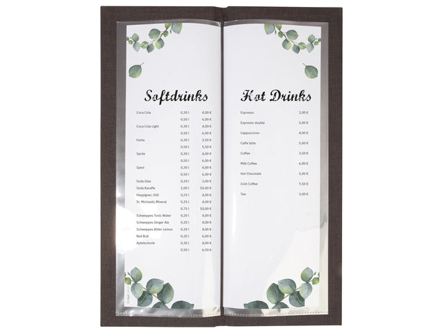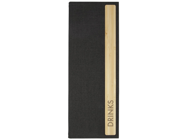De tijdloze en hoogwaardige drankenkaart heeft een rubberbinding aan de binnenzijde met 2 inschuifbare dubbele transparante insteekhoezen voor in totaal 8 pagina's informatie. De pagina's kunnen eenvoudig worden ingevoegd en steeds opnieuw worden uitgewisseld. Geschikt voor A4-formaat. De gerecyclede PET omslag met houten inzetstuk bamboe (FSC-gecertifceerd) is aan de voorzijde voorzien met internationale zeefdruktekst 'Drinks'. drankenkaart is ideaal voor dagelijks gebruik in de horeca. Kleur drankenkaart donkergrijs/bamboe.