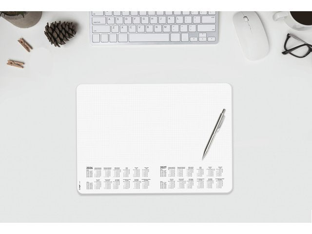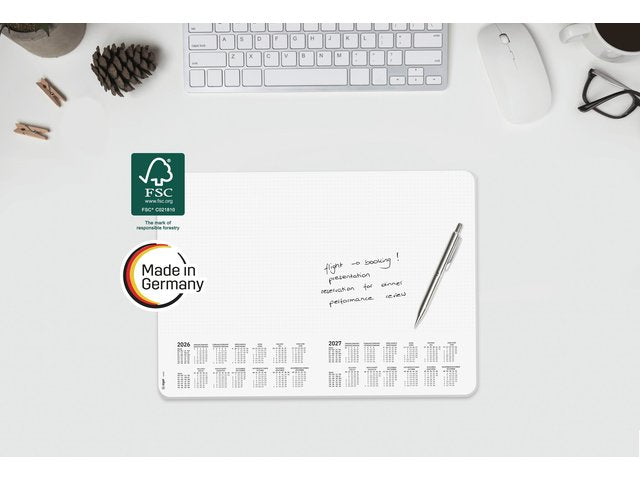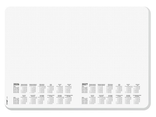 Praktische bureauonderlegger met dag-weekplan en actuele kalender voor 2 jaren. Formaat A3 (42x29,7cm) met afgeronde hoeken en hoogwaardig 80 grams papierkwaliteit met dot-liniatuur (punt-gelijnd). Taal D/GB/F/NL. De papier-schrijfonderlegger heeft 30 vel en kan als een afscheurblok worden gebruikt. De stevige kartonnen rug met verlijming aan de onderkant en gedeeltelijk aan de bovenkant voorkomen dat de hoeken omknikken. Kalender 2026/2027.