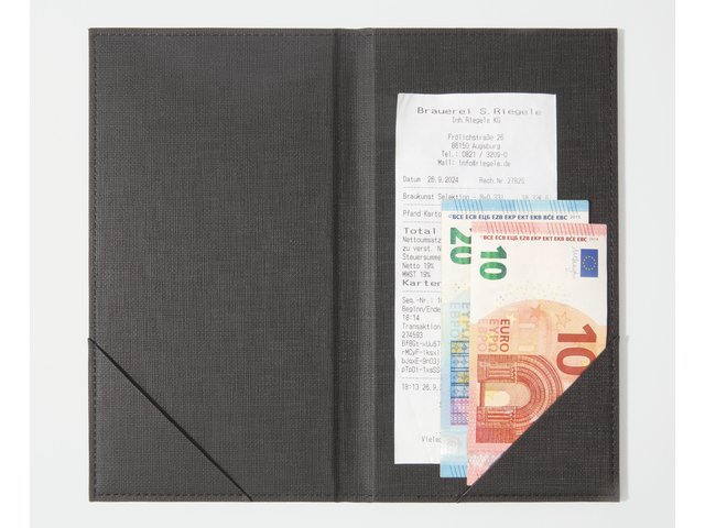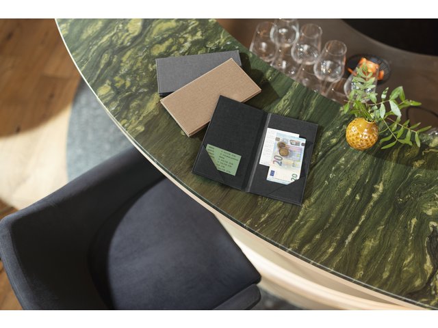 Handige, slanke facturenmap voor het invoegen van facturen, kwitanties, contant geld en creditcards. Voorzien van 2 schuine insteekvakken aan de binnenzijde. Slijtvaste PU omslag met elegante linnenstructuur. Het duurzaam PU-materiaal (zonder weekmakers) is bestand tegen slijtage, krassen en schuren en eenvoudig schoon te maken. De factuurmap is ideaal voor dagelijks gebruik in de horeca. Formaat 130 x 230 x 10mm. Kleur antraciet.