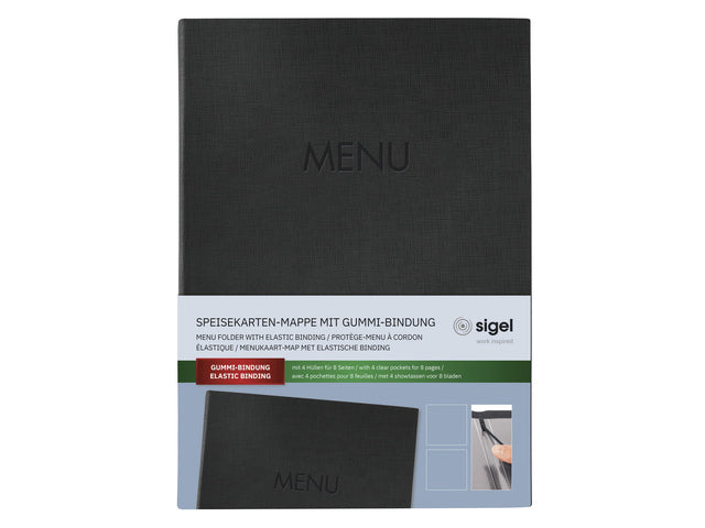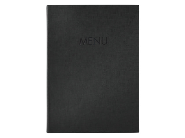 De tijdloze en hoogwaardige menukaart map heeft een rubberbinding aan de binnenzijde met 2 inschuifbare dubbele transparante insteekhoezen voor in totaal 8 pagina's informatie. De pagina's kunnen eenvoudig worden ingevoegd en steeds opnieuw worden uitgewisseld. Geschikt voor A4-formaat. De slijtvaste PU omslag met elegante linnenstructuur is aan de voorzijde voorzien met internationale blinddruk tekst 'Menu'. Het duurzaam PU-materiaal (zonder weekmakers) is bestand tegen slijtage, krassen en schuren en eenvoudig schoon te maken. Menukaart map is ideaal voor dagelijks gebruik in de horeca. Kleur menumap zwart.