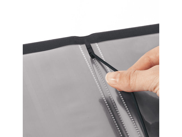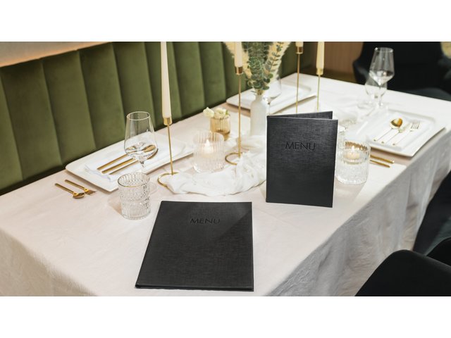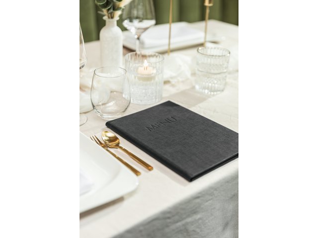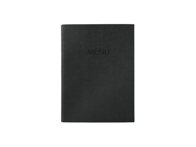 De tijdloze en hoogwaardige menukaart map heeft een rubberbinding aan de binnenzijde met 2 inschuifbare dubbele transparante insteekhoezen voor in totaal 8 pagina's informatie. De pagina's kunnen eenvoudig worden ingevoegd en steeds opnieuw worden uitgewisseld. Geschikt voor A5-formaat. De slijtvaste PU omslag met elegante linnenstructuur is aan de voorzijde voorzien met internationale blinddruk tekst 'Menu'. Het duurzaam PU-materiaal (zonder weekmakers) is bestand tegen slijtage, krassen en schuren en eenvoudig schoon te maken. Menukaart map is ideaal voor dagelijks gebruik in de horeca. Kleur menumap zwart.