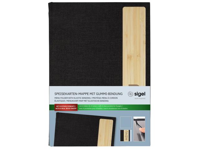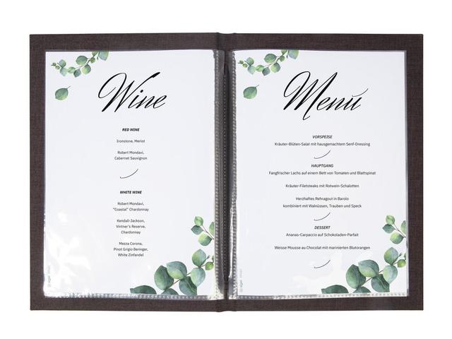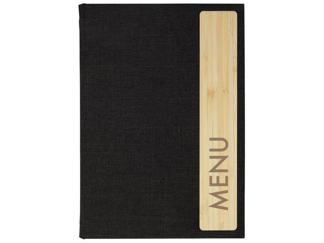 De tijdloze en hoogwaardige menukaart map heeft een rubberbinding aan de binnenzijde met 2 inschuifbare dubbele transparante insteekhoezen voor in totaal 8 pagina's informatie. De pagina's kunnen eenvoudig worden ingevoegd en steeds opnieuw worden uitgewisseld. Geschikt voor A5-formaat. De gerecyclede PET omslag met houten inzetstuk bamboe (FSC-gecertifceerd) is aan de voorzijde voorzien met internationale zeefdruktekst 'Menu'. Menukaart map is ideaal voor dagelijks gebruik in de horeca. Kleur menumap donkergrijs/bamboe.