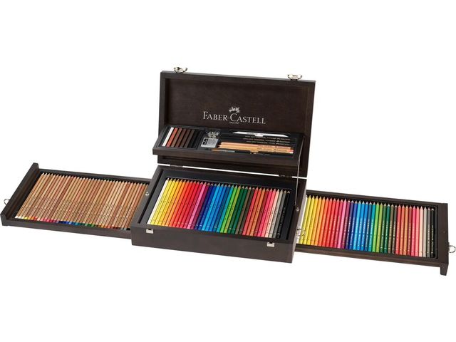 Voor de kunstenaar zijn ze een prestigieus gereedschap in het vak, voor de kenner zijn ze een decoratief designobject: de elegante, in mahonie gebeitste koffers van Faber-Castell. Geavanceerde producten zijn een essentieel onderdeel voor creatief ontwerp. De Pitt pastelpotloden, de Polychromos potloden, de Albrecht Dürer aquarelpotloden en de kleine reeks Pitt Monochrome potloden worden gepresenteerd in een koffer met twee niveaus en 2 zijlades. Deze luxe koffer bestaat uit 3x36 potloden assorti en accessoires.