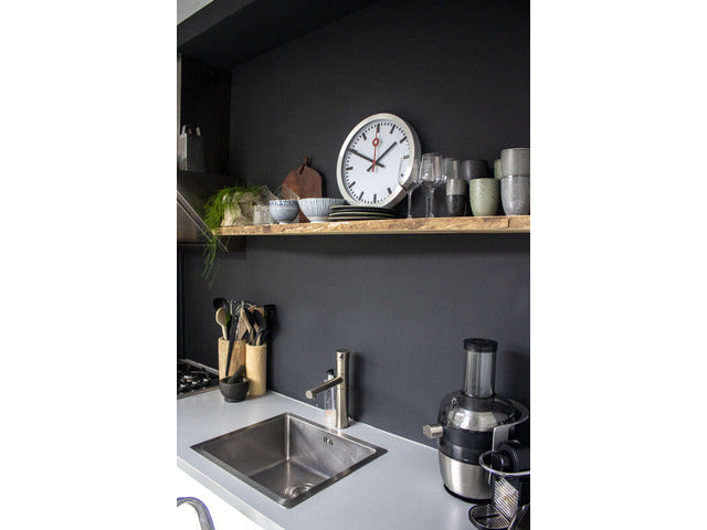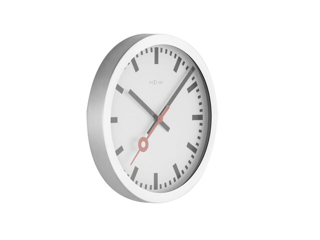 De NeXtime wandklok Station is een favoriet bij velen klok liefhebbers. De klok combineert een bekend en traditioneel ontwerp met de NeXtime stijl. De klok heeft een aluminium rand met een witte wijzerplaat en transparant kunststof voorplaat.. De strepen geven de uren en minuten weer. De rood/oranje secondewijzer loopt geleidelijk rond, waardoor de klok geluidloos is. Ook verkrijgbaar in een uuraanduiding met cijfers.