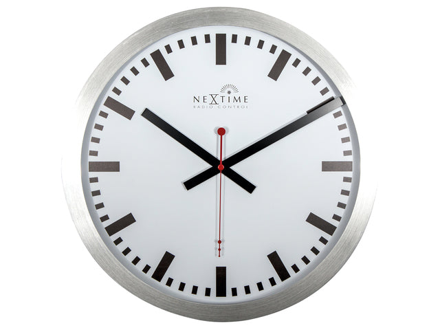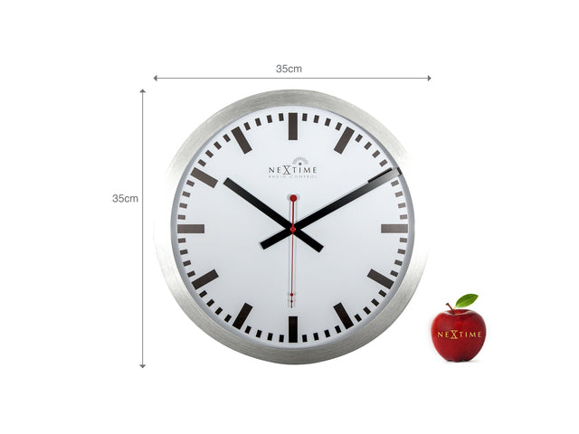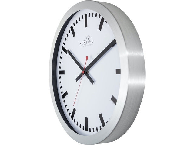 De NeXtime Station wandklok is een favoriet bij vele klokliefhebbers. Deze klok combineert een bekend en traditioneel ontwerp met de NeXtime stijl. De klok heeft een aluminium rand met een witte wijzerplaat. De zwarte strepen geven de uuraanduiding aan. De rode opengewerkte secondewijzer loopt geleidelijk rond, waardoor de klok geluidloos is. Deze klok is radio controlled, waardoor u nooit meer de tijd goed hoeft te zetten, dat gaat vanzelf! Afm. 35cm