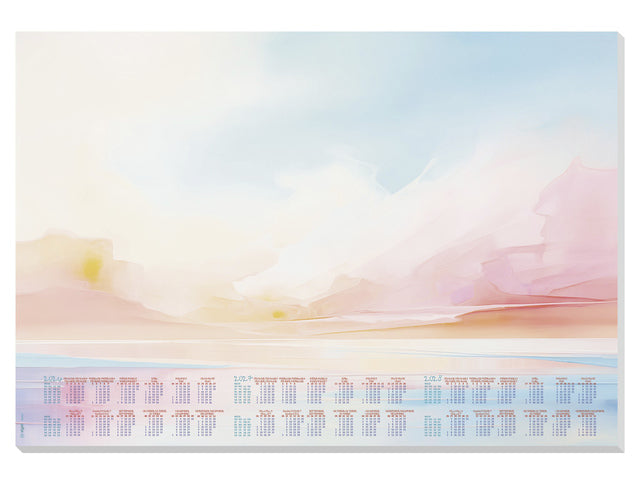 Praktische bureauonderlegger "Magic Sunset" in formaat ca. A2 (59,5x41cm). De bureauonderlegger heeft 30 vel 80 grams FSC-gecertificeerd papier met zonsondergangmotief, is afscheurbaar en beschrijfbaar, met een actuele 3-jarige kalender 2026/2027/2028. Taal D/GB/F/NL. De stevige kartonnen rug met verlijming aan de onderkant en gedeeltelijk aan de bovenkant voorkomen dat de hoeken omknikken. Ideaal formaat voor elk bureau: een blikvanger, decoratief, praktisch en beschermt uw bureau op kantoor en thuis tegen inkt en hete kopjes.