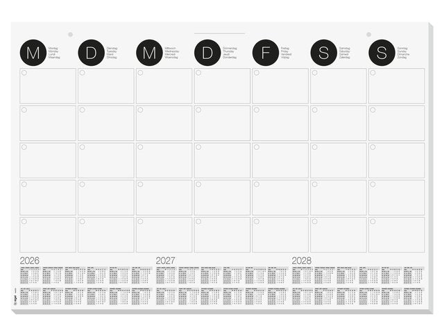 Een papieren bureauonderlegger en wandkalender in één - de keuze is aan jou. Een praktische maandplanner in formaat ca. A2 (59,5x41cm) Door de voorgestanste gaten is de bureauonderlegger eenvoudig aan de muur te hangen. Voor op kantoor, thuiskantoor of keuken kan de praktische maandplanner worden aangepast aan jouw behoeften: vul de maand en weekdagen in en maak uw eigen persoonlijke plan voor de komende maand. De praktische 3-jaren kalender dient daarbij als richtlijn. De papieren bureauonderlegger is van 120 grams papier. Inhoud 12 vel afscheurbaar en beschrijfbaar. De weekdagen zijn gedrukt in een eenvoudig maar elegant lettertype. Taal D/GB/F/NL. Kalender 2026/2027/2028.