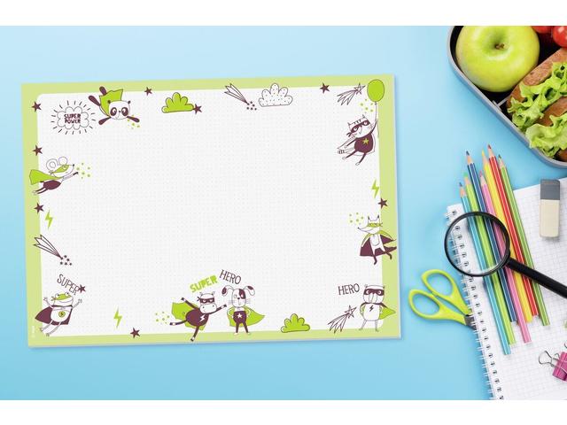 Praktische bureauonderlegger speciaal voor kleuters en basisschoolleerlingen. Formaat A3 van hoogwaardig 80 grams papierkwaliteit (FSC-gecertificeerd) met dot-liniatuur (punt-gelijnd) en afbeeldingen. De papier-schrijfonderlegger heeft 30 vel en kan als een afscheurblok worden gebruikt. De stevige kartonnen rug met verlijming aan de onderkant en gedeeltelijk aan de bovenkant voorkomen dat de hoeken omknikken. Ideaal formaat voor op school of thuis: een blikvanger, decoratief, praktisch en beschermt de keukentafel of het bureau tegen geknoei. Uitvoering Little Heroes.
