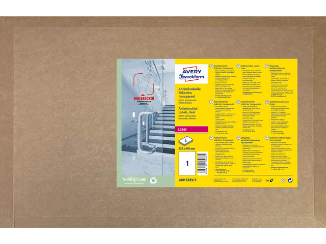 Onze antimicrobiële etiketten doden 99,9% van alle bacteriën en microben en zijn effectief tegen ziektekiemen. Deze beschermfolies zijn perfect om te gebruiken op oppervlakten die regenmatig aangeraakt worden. Denk hierbij aan lichtschakelaars, handgrepen op bijvoorbeeld winkelwagentjes, bureau-oppervlakken, boeken, liftknoppen, toonbanken, leuningen, deuren, pennen en allerlei touchscreens. Zorg er voor dat het oppervlak voor het aanbrengen schoon en vetvrij is. Let wel; deze etiketten gebruikt u ter aanvulling op reeds bestaande reinigings- en desinfectieprocedures om verspreiding van ziektekiemen te voorkomen. Hoe werken deze antimicrobiële labels? Deze folie-etiketten zijn behandeld met een antimicrobiële coating die 99,9% van alle soorten micro-organismen betrouwbaar verwijdert. Micro-organismen zijn bijvoorbeeld virussen, bacteriën, ziektekiemen en schimmels wat betekent dat de etiketten antibacterieel en antiviraal zijn. De antimicrobiële werking wordt geactiveerd door zichtbaar licht en zuurstof, wat zorgt voor een snel en langdurig effect. Het actieve principe is klinisch getest en geverifieerd door onafhankelijke instituten in overeenstemming met ISO 22196. De antimicrobiële labels zijn onschadelijk voor de gezondheid, omdat ze worden geproduceerd zonder het gebruik van nanodeeltjes of giftige biociden. Deze transparante, permanent klevende filmetiketten in het formaat 105 x 148 mm (A6) overtuigen door een langdurige werking en hebben een garantie van minimaal 1 jaar. Bovendien zijn ze zeer slijtvast, scheurvast, waterdicht en bestand tegen reinigings- en desinfectiemiddelen, water, olie en temperaturen (-20 C tot + 80 C). De folies kunnen in elke gewenste vorm en grootte worden gesneden zonder de antimicrobiële werking aan te tasten. De verpakking bevat 40 antimicrobiële etiketten.U kunt deze antimicrobiële etiketten met softwarecode L8013 bovendien bedrukken met laserprinters. Let op: vermijd het bedrukken van het volledige oppervlak van het etiket. In dit geval zou de toner het antimicrobiële oppervlak van het etiket volledig bedekken en de doeltreffendheid ervan verminderen. Passende software en templates vindt u op avery.eu/print. Uit ons aanbod bedrukbare antimicrobiële etiketten kunt kiezen uit 3 verschillende formaten in transparant of wit folie. Belangrijk om te weten: Kan dit etiket de overdracht van het COVID-19-virus voorkomen? Dit product is nog niet expliciet getest op COVID-19-virussen! Het is echter getest op andere varianten van dezelfde familie van menselijke coronavirussen (ISO 21702 Humaan Corona Virus NL63) met vergelijkbare celstructuren en er is aangetoond dat het zeer effectief is. De effectiviteit tegen H1N1-virussen is bevestigd door onafhankelijke laboratoria.