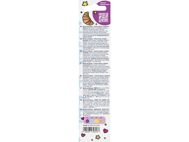 Deze creatieve set Bold Easy II bevat 4 Goldfaber sketchmarkers op alcoholbasis met sneldrogende inkt en twee verschillende penpunten (fineliner met metalen behuizing 0.6 mm en penseelpunt) die zorgen voor een geweldige kleurrvaring. De inkt is veegvast, waterbestendig en droogt snel. De doppen en de houders van de sketchmarkers zijn gemaakt van 100% gerecycled materiaal en kunnen kleurvariaties vertonen door de productie. Via de QR-code op de verpakking kun je een kleurplaten downloaden die moeiteloos gemakkelijk in te kleuren zijn. Inhoud set World of Food: kleurnummers