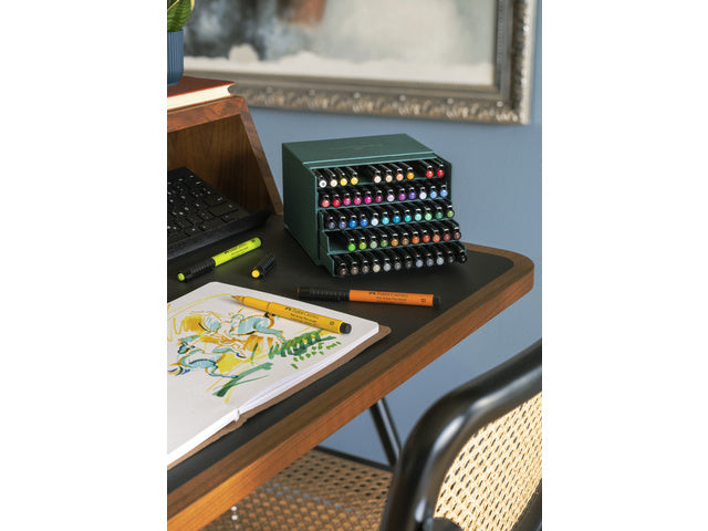 Tekenstift met brushtip voor schetsen, studies, tekeningen, opschriften, ontwerpen en lay-outs. Hoogwaardige pigmentering met een uitstekende kleurkracht, hoge lichtbestendigheid, watervast, goed inktvloed en gelijkmatige kleurafgifte. Studiobox 60-delig, de box is gemaakt van gerecycled materiaal.