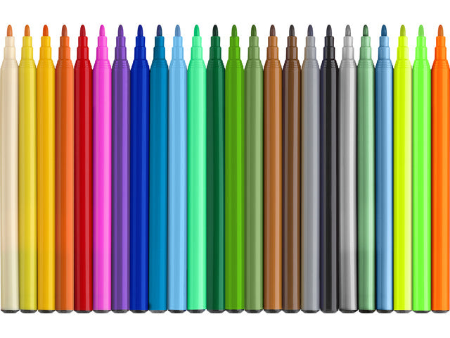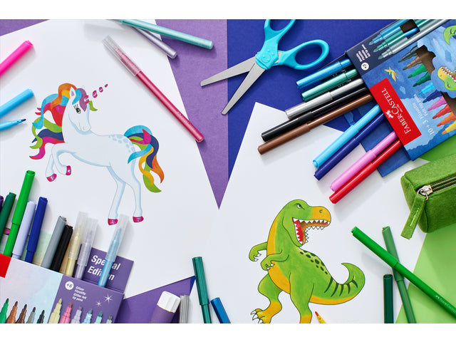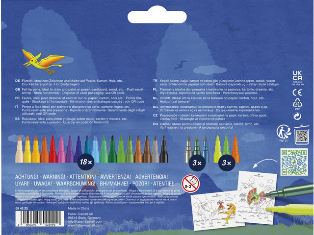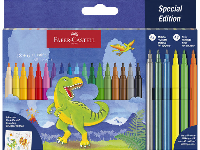 Viltstiften Dino Special Edition 18+3+3. Deze viltstiften zijn ideaal om mee te kleuren en te tekenen op papier, karton, hout, etc. De viltstiften zijn voorzien van een sterke ronde M punt met inkt op waterbasis. De inkt is uitwasbaar (30graden) uit de meeste textielsoorten en afwasbaar van handen en huid. Inhoud set 18 standaardkleuren + 3 metallic + 3 neon viltstiften en Dino stickervel.