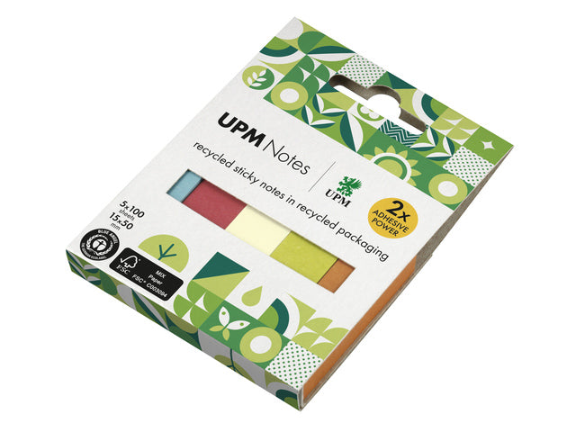 De UPM page markers zijn voorzien van 25 mm plakrand met lijm op waterbasis met dubbele kleefkracht, in vergelijking met standaard plaknotities, en gemakkelijk te verwijderen en opnieuw te plaatsen zonder residu. UPM Notes zijn gemaakt van FSC-gecertificeerd (FSC C003094) papier uit duurzaam beheerde bossen en andere gecontroleerde bronnen. De notitieblokken zijn zorgvuldig verpakt in een kartonnen doos van gerecycled materiaal, dat de blokken beschermt tegen vuil en beschadiging. De verpakking kan gemakkelijk worden weggegooid in de papierbak, zodat het probleemloos gerecycled kan worden. Gecertificeerd met het Blauwe Engel keurmerk, het oudste eco-label ter wereld. Formaat blok 15x50mm. Inhoud 5x blok met 100 vel in assorti kleuren.