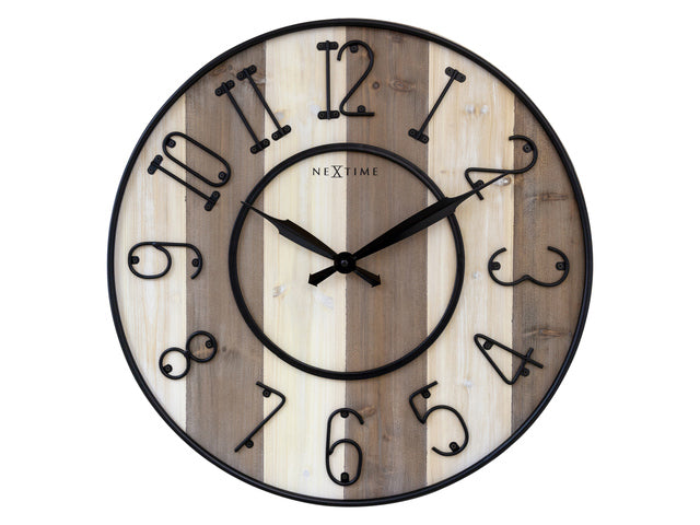 Met zijn robuuste metalen details straalt deze grote NeXtime "Oxford" wanddklok (Ø 50cm) landelijke elegantie uit. De wijzerplaat heeft een mooi lineaire patroon van lichtbruin en gebroken wit en de wijzers zijn subtiel zwart. Iedere klok is uniek doordat elke klok uit een ander stuk hout is vervaardigd. De heldere zwarte metalen nummer index zorgt ervoor dat je zelfs van verre afstand de tijd moeiteloos kan aflezen. Deze klok is stil en werkt op 1x AA batterij (niet inbegrepen)