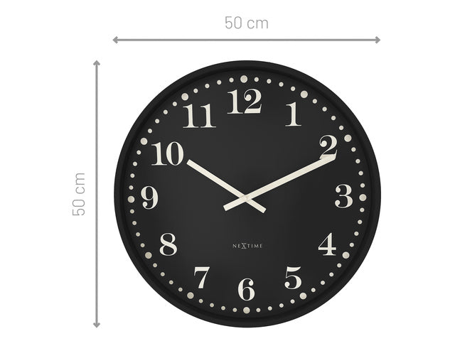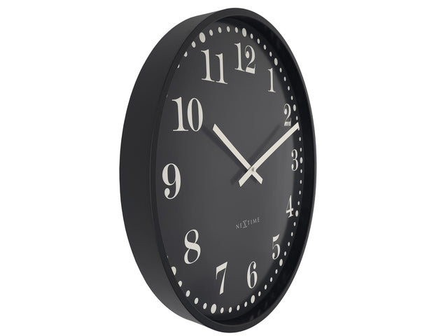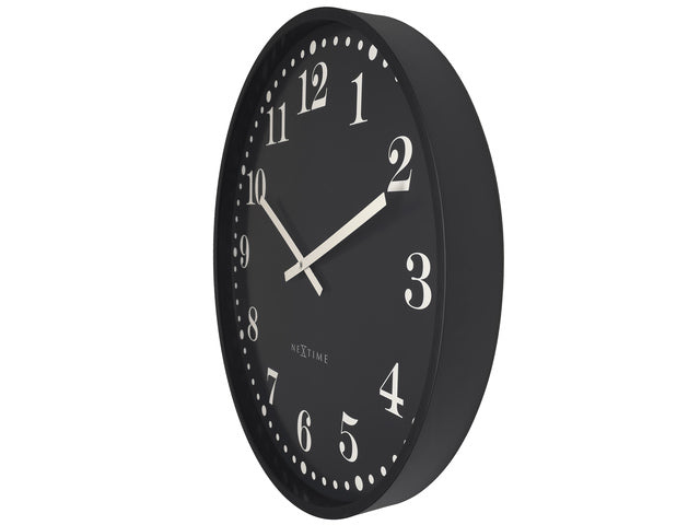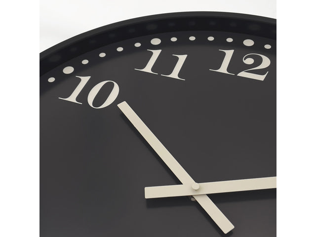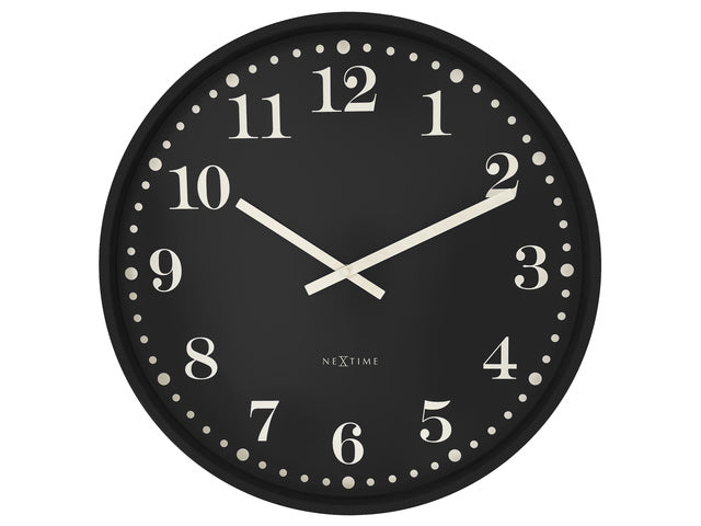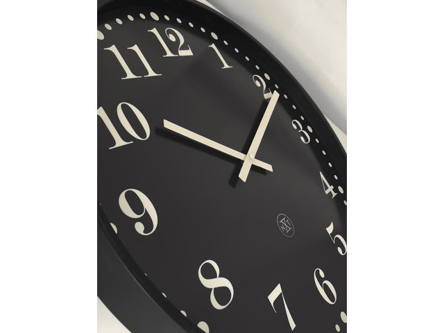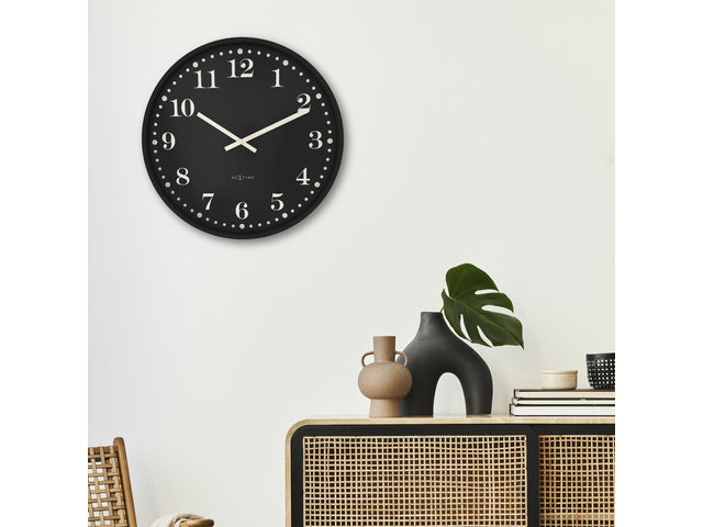 De Dickens Large (50 cm) is een stille kunststof wandklok met een slanke zwarte kast in combinatie met een zwarte wijzerplaat. De uitstraling is modern retro met een knipoog naar vintage esthetiek. Deze klok werkt op 1 x AA-batterij (niet meegeleverd).