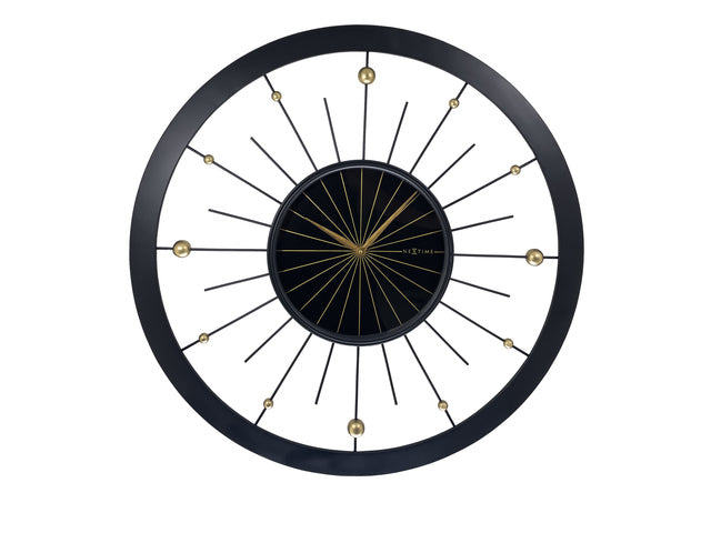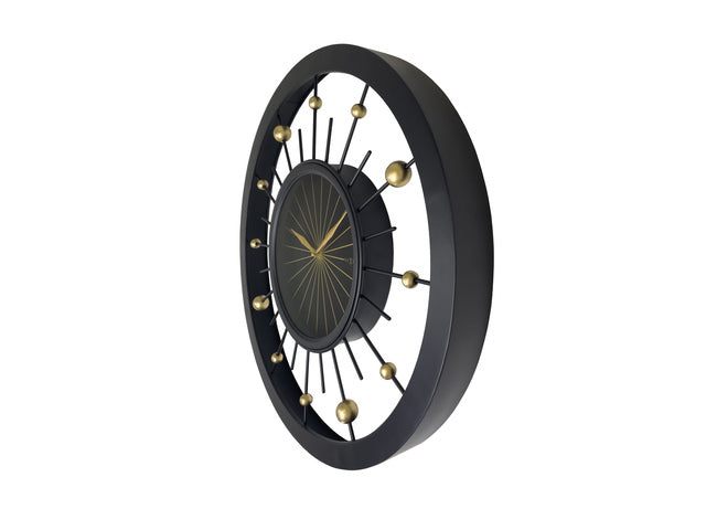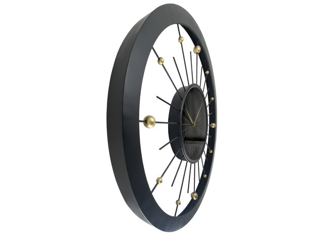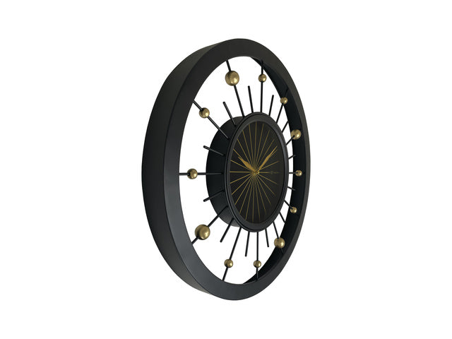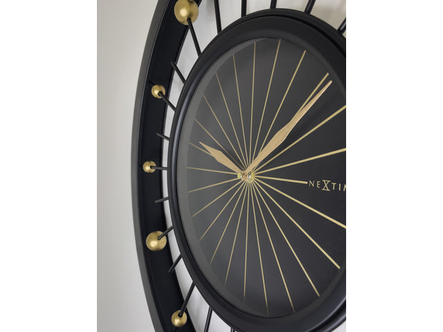 De Orbit (60 cm) is een stille wandklok in strak zwart metaal met opvallende gouden accenten die een gedurfd, eigentijds statement laat zien. Het minimalistische ontwerp en de contrasterende kleuren maken het een opvallend stuk in elke moderne inrichting. Deze klok werkt op 1 x AA-batterij (niet meegeleverd).