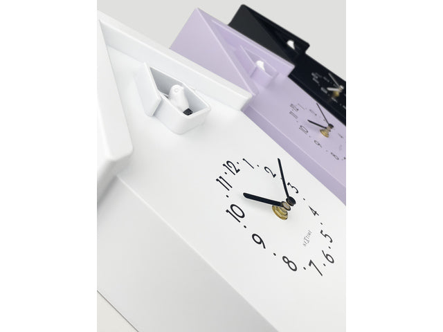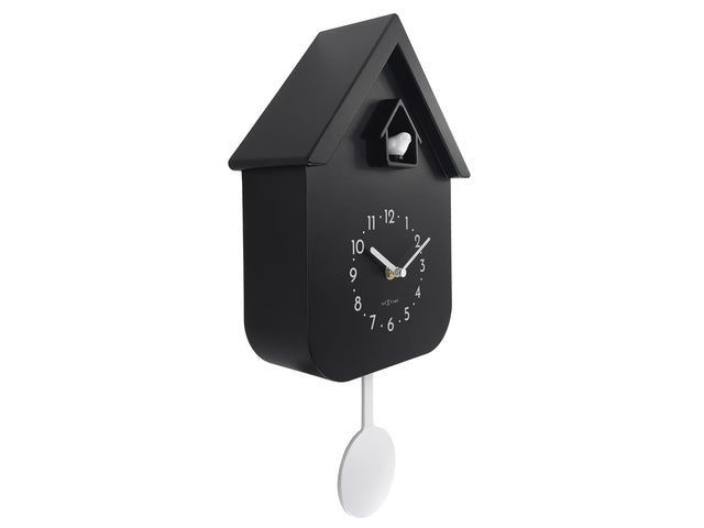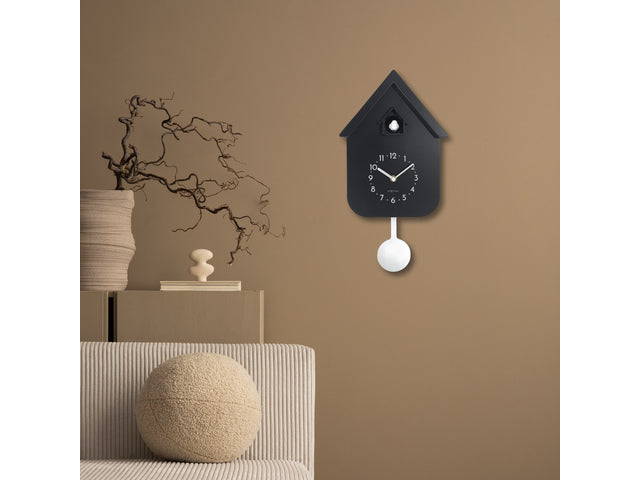 De Twitter (21,5 x 41,5 cm ) is een speelse draai van de klassieke koekoeksklok en combineert vintage charme met een eigentijdse look in een coole kleur. Geniet van het wakker worden met natuurgeluiden, die het verstrijken van de tijd zachtjes markeren. Het geluid kan ook uitgeschakeld worden. De stille klok werkt op 3 x AA-batterijen (niet inbegrepen). Kleur zwart.