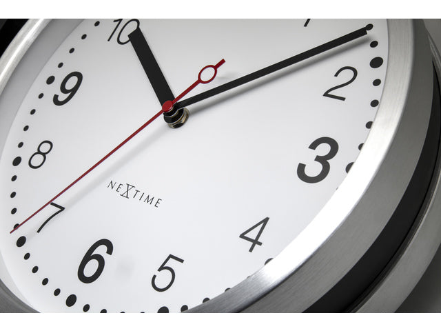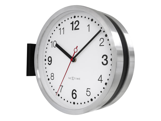 De Double Small (32 cm) heeft een dubbelzijdige stille wandklok gemaakt van aluminium en glas. De tijd is zichtbaar vanaf beide kanten van de klok. Perfect voor werk, studie of openbare omgeving. De klokken worden met magneten aan het frame bevestigd. Afmeting 32.3 x 28 x 10 cm. Elke kant van de klok werkt op 1 x AA batterij, je hebt 2 x AA batterij nodig om ze allebei te laten werken (batterijen niet inbegrepen).
