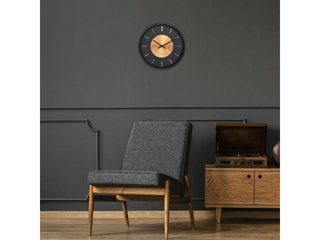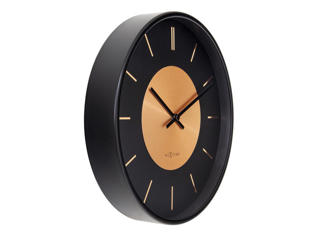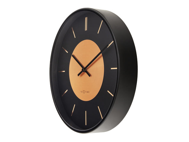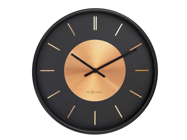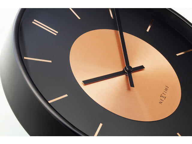Wandklok Retro II (25cm) van NeXtime brengt een eigentijdse twist aan de glamoureuze stijl van de jaren 60. Dit stille uurwerk in zwart/koper met strakke zwarte wijzers steken scherp af tegen de contrasterende achtergrond, waardoor de tijdsaanduiding duidelijk en eenvoudig te lezen is. Deze combinatie van functionaliteit en design voegt niet alleen een vleugje moderne luxe toe aan je interieur, maar brengt ook een eerbetoon aan de rijke geschiedenis van design uit het verleden. Deze klok werkt op 1 x AA batterij (niet inbegrepen).
