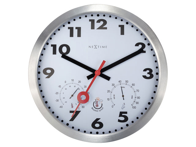 De NeXtime "Clematis" is een zeer complete aluminium tuinklok die ook de temperatuur en de luchtvochtigheid weergeeft. Speciaal gemaakt voor buiten! Het gebruik van extra rubberen ringen om te voorkomen dat het water de kwetsbare delen van de klok bereikt en de speciale coating op het aluminium maakt deze klok bijzonder en weerbestendig. Als u op de hoogte wilt zijn van uw tuin, dan is dit de klok voor u! Tijd, temperatuur en vochtigheid in 1 apparaat. De klok is robuust en van aluminium en met een diameter van 35cm past hij overal. De wijzerplaat is wit en heeft een grote index voor de uuraanduiding. Door de zwarte wijzers en de grote rode secondewijzer zijn de klok en de meters goed afleesbaar. De klok werkt op 1 AA-batterij (niet inbegrepen).