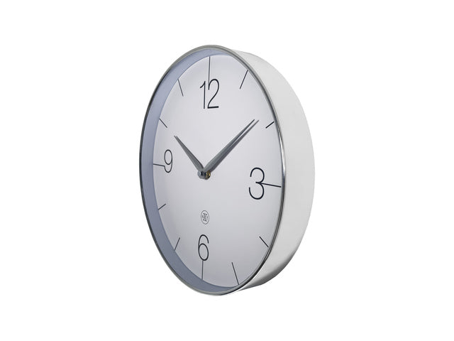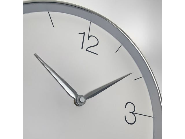 De Finesse (30,5 cm) is een mix van eenvoud en elegantie. Deze stille wandklok heeft een minimalistische stijl en de dunne zilveren rand en wijzers voegen een vleugje verfijning toe aan elke ruimte. Deze klok werkt op 1 x AA-batterij (niet inbegrepen).
