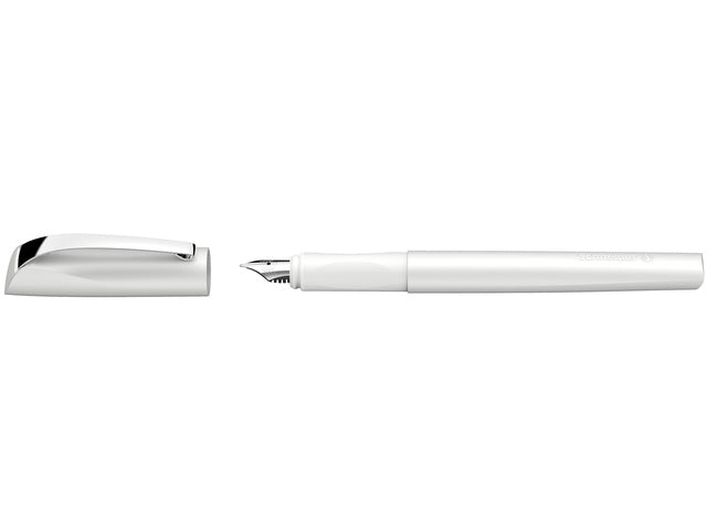 Vulpen met elegante metallic look. Modern ontwerp met opvallende rondingen. Ergonomisch gripprofiel en hoogwaardige roestvrijstalen punt met iridiumpunt M. Standaard inktcartridges, koningsblauw, uitwisbaar. Stevige metalen clip. Geschikt voor rechts- en linkshandigen. Kleur: Parel wit