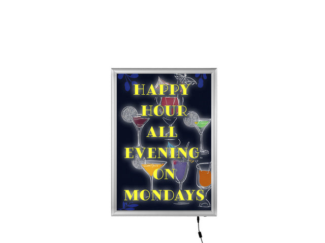 Deze aluminium A3-formaat kliklijst in zilver met LED-verlichting heeft een profielbreedte van 25 mm, een diepte van 18 mm, met rechte hoeken. De LED-verlichting op de achterplaat zorgt voor volledige verlichting van aankondigingen. Het frame biedt een stijlvolle manier om posters, documenten, certificaten, advertenties, promoties of andere belangrijke berichten te presenteren in uiteenlopende omgevingen zoals bedrijven, kantoren, scholen, cafés, restaurants, winkels, bioscopen, theaters en ziekenhuizen. Het verwisselen van de inhoud gaat eenvoudig: de lijst kan aan de voorzijde worden opengeklikt, waarna de voorplaat wordt verwijderd en de nieuwe aankondiging direct geplaatst kan worden, zonder de lijst van de wand te halen. De kliklijst is geschikt voor binnengebruik en kan dankzij de voorgeboorde gaten gemakkelijk aan de wand worden bevestigd. Alle vier de zijden zijn te openen en voorzien van verstekhoeken. De kliklijst heeft een ingebouwde voeding met 3,5 meter kabel, dus er is geen transformator nodig. De aankondigingen blijven beschermd achter een UV-bestendige en antireflecterende voorplaat van PET. Alles wordt afzonderlijk verpakt geleverd, inclusief schroeven en pluggen.