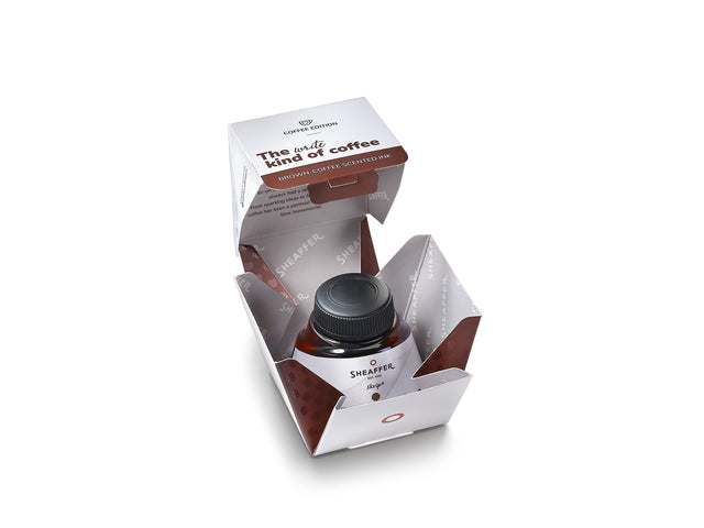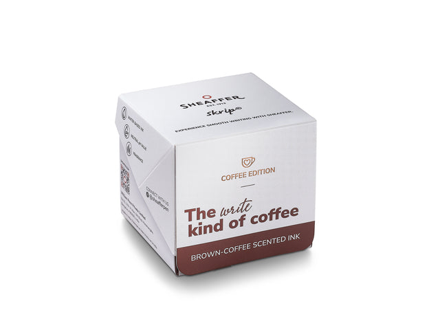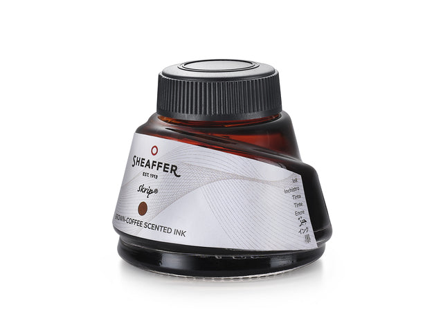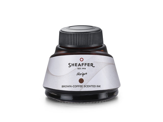 Sheaffer inktpotje Skrip 50 ml met bruine inkt met koffiegeur. Skrip is een watergebaseerde, pH-neutrale inkt van hoge kwaliteit die compatibel is met alle vulpennen en gebruikt kan worden voor het vullen van een converter (artikelnummer: SF-96700). De speciaal samengestelde inkt vloeit soepel over het papier.