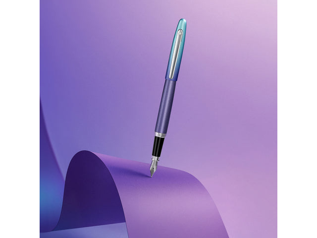 Sheaffer vulpen Expressions VFM 9430 in blauw kleurverloop met chrome afwerking is voorzien van een medium penpunt M dat een nauwkeurig en betrouwbaar schrijfcomfort garandeert. Inclusief een Sheaffer convertor die zelf gevuld kan worden. De populaire Sheaffer vulpen VFM maakt indruk met zijn moderne, taps toelopende silhouet en is een combinatie van moderne elegantie en de hoogste kwaliteit. De wereldwijd erkende witte Sheaffer stip, die symbool staat voor schrijfexcellentie, kwaliteit en prestige, is terug te vinden op de clip. De Sheaffer VFM pennen zijn beschikbaar als vulpen, rollerball en balpen in een breed scala van eigentijdse kleuren en worden geleverd in mooie geschenkdoos.