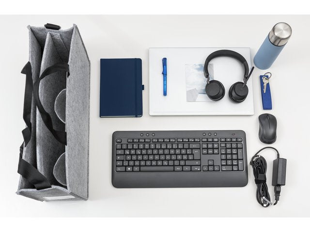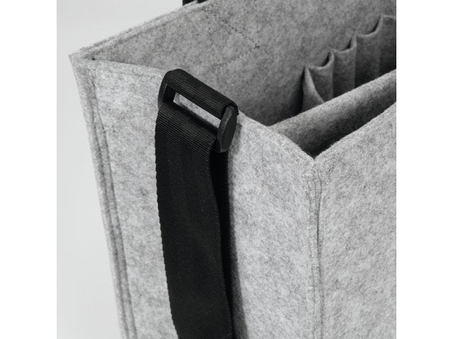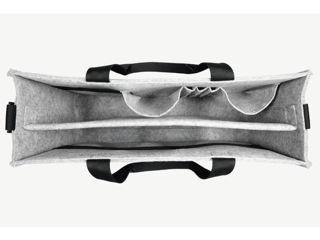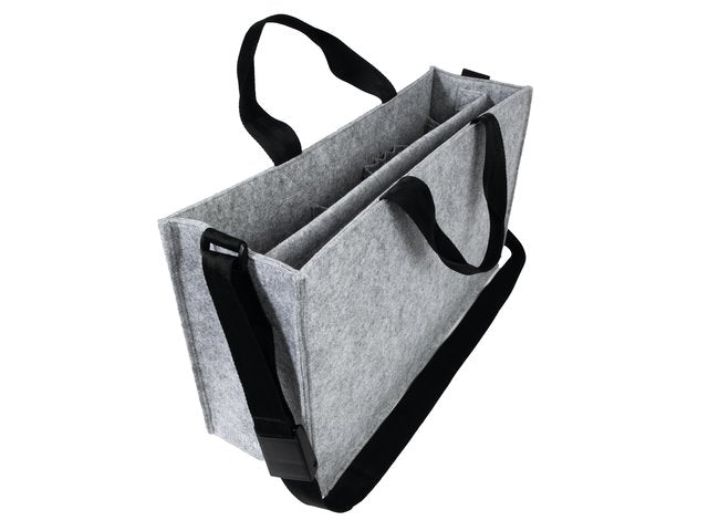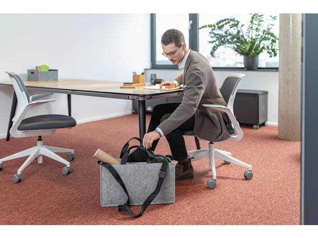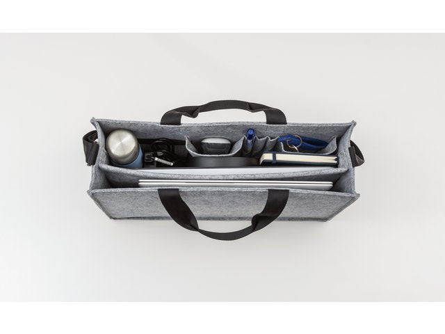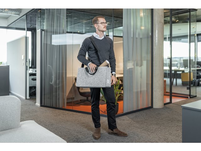 Hoogwaardige bureautas Classic Large in het formaat 500 x 280 x 150 mm (B x H x D) van robuust, vuilafstotend synthetisch vilt (2x3mm, 100% RPET). Inclusief transparant vak voor individuele etikettering. Staat heel stevig met en zonder inhoud dankzij de brede onderkant. Als het nieuwe werken uw dagelijkse bezigheden bepaalt, u pendelt tussen uw bureau, vergaderruimte en thuiskantoor of u wilt flexibel blijven dankzij DeskSharing, dan is deze Clean Desk Organizer uw nieuwe musthave. Pak uw laptop, werkdocumenten, mappen, smartphone, oplaadkabel, voeding, pennen, toetsenbord en nog veel meer in deze tas - zo heeft u alle belangrijke dingen bij de hand op elke werkplek. Geschikt voor laptops tot 17.3 inch. Met 2 stevige handgrepen en verstelbare schouderriem in zwart, 2 grote binnenvakken, 5 kleine vakken en 3 elastische banden. Kleur lichtgrijs.