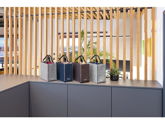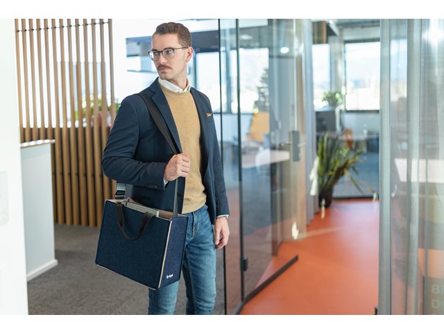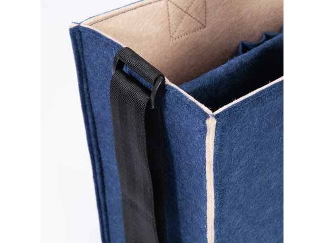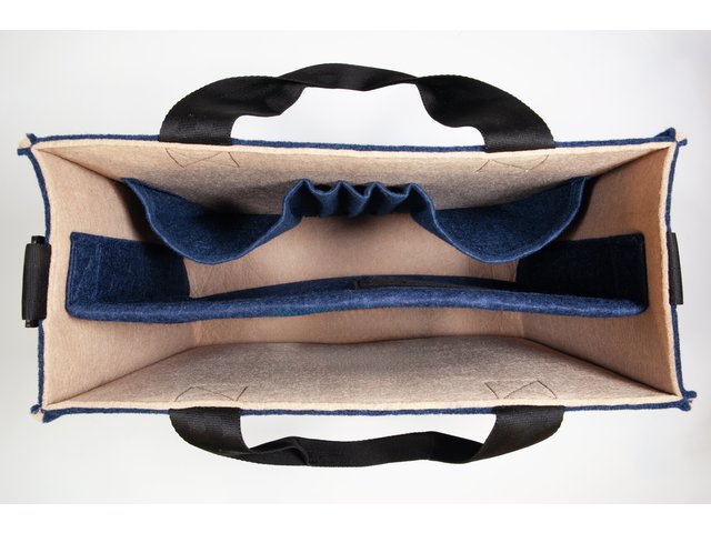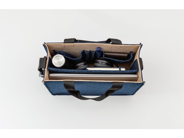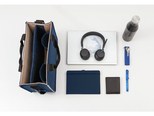 Hoogwaardige bureautas Bicolor Medium in het formaat 360 mm x 280 mm x 150 mm (B x H x D) van robuust, vuilafstotend synthetisch vilt (2x3mm, 100% RPET). Staat heel stevig met en zonder inhoud dankzij de brede onderkant. Als het nieuwe werken uw dagelijkse bezigheden bepaalt, u pendelt tussen uw bureau, vergaderruimte en thuiskantoor of u wilt flexibel blijven dankzij DeskSharing, dan is deze Bicolor Desk Organizer uw nieuwe musthave. Pak uw laptop, werkdocumenten, mappen, smartphone, oplaadkabel, voeding, pennen, toetsenbord en nog veel meer in deze tas - zo heeft u alle belangrijke dingen bij de hand op elke werkplek. Geschikt voor laptops tot 15.4 inch. Met 2 stevige handgrepen en verstelbare schouderriem in zwart, 2 grote binnenvakken, 5 kleine vakken en 1 platte elastische band. Kleur blauw/beige.