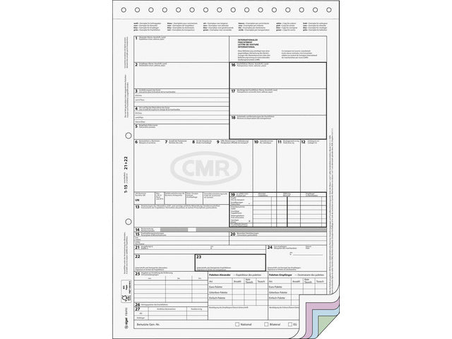 Vrachtbrieven CMR A4 volgens de internationale standaard. Dubbelzijdig bedrukt, met scheidingsstrook bovenaan (18 cm). Zelfkopiërend met wit voorvel en 3 gekleurde doorslagen. Inhoud blok met 50 sets.