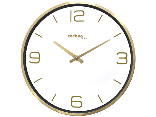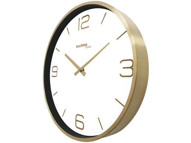 Wandklok WT 7280 (30,5 cm ) is een quartz klok in wit met gouden metalen frame. Tijdsaanduiding in gouden cijfers en werkt op 1x AA batterij LR06 (niet meegeleverd).